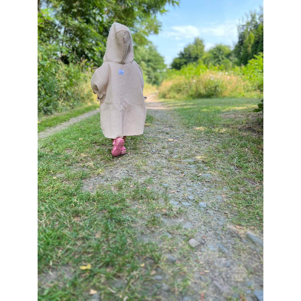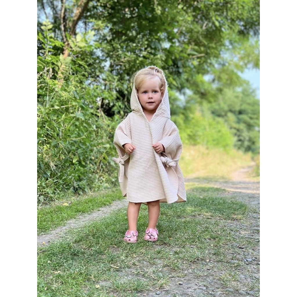 Praktické a zároveň velmi roztomilé dětské pončo z příjemné tkaniny ve vzoru vaflí. Na bocích má dva pásky, které snadno zavážete. Je to praktické při oblékání dítěte.