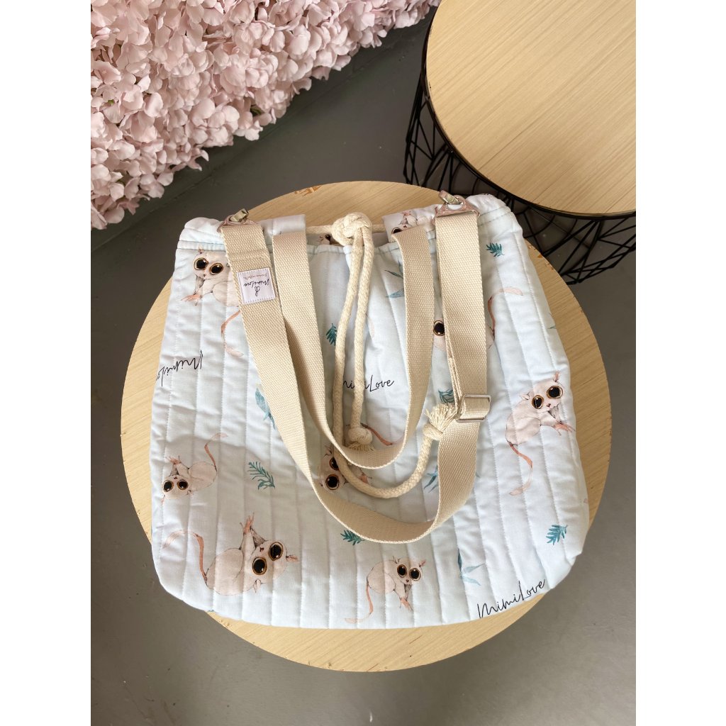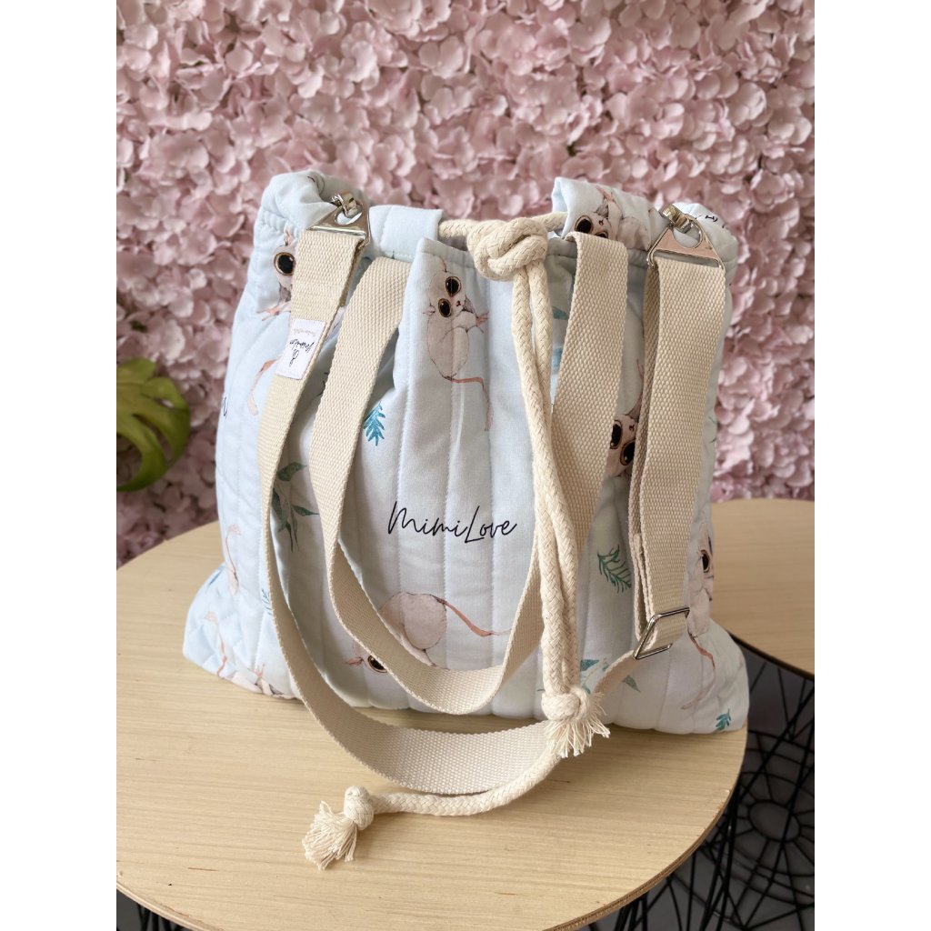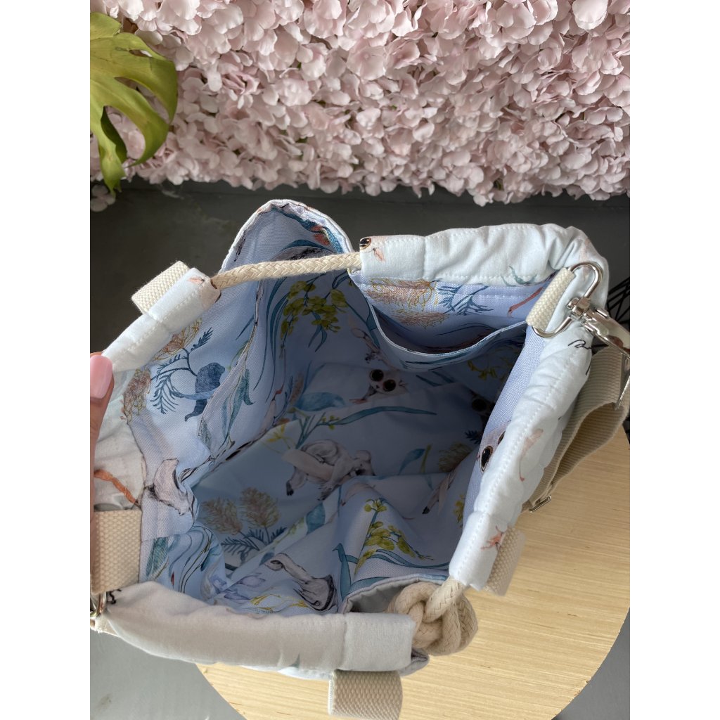 Taška je vyrobena z bavlněného materiálu a uvnitř je nepromokavý materiál ve stejném vzoru, který zaručuje voděodolnost a snadnou údržbu. Stačí vždy otřít vlhkým hadříkem. Taška má dvě kratší pevná ucha a jeden nastavitelný dlouhý popruh, kterým lze taška nosit přes rameno, uzavírání je řešeno stažením pásku.